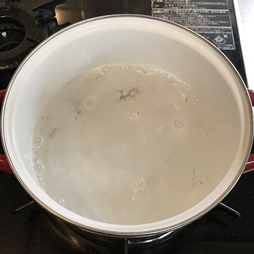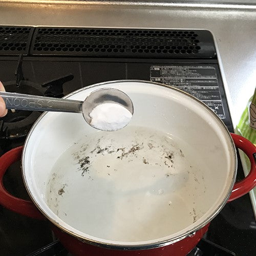 琺瑯鍋內加入足夠的水(覆蓋需清潔的位置),加入約 2 茶匙蘇打粉,然後加熱。