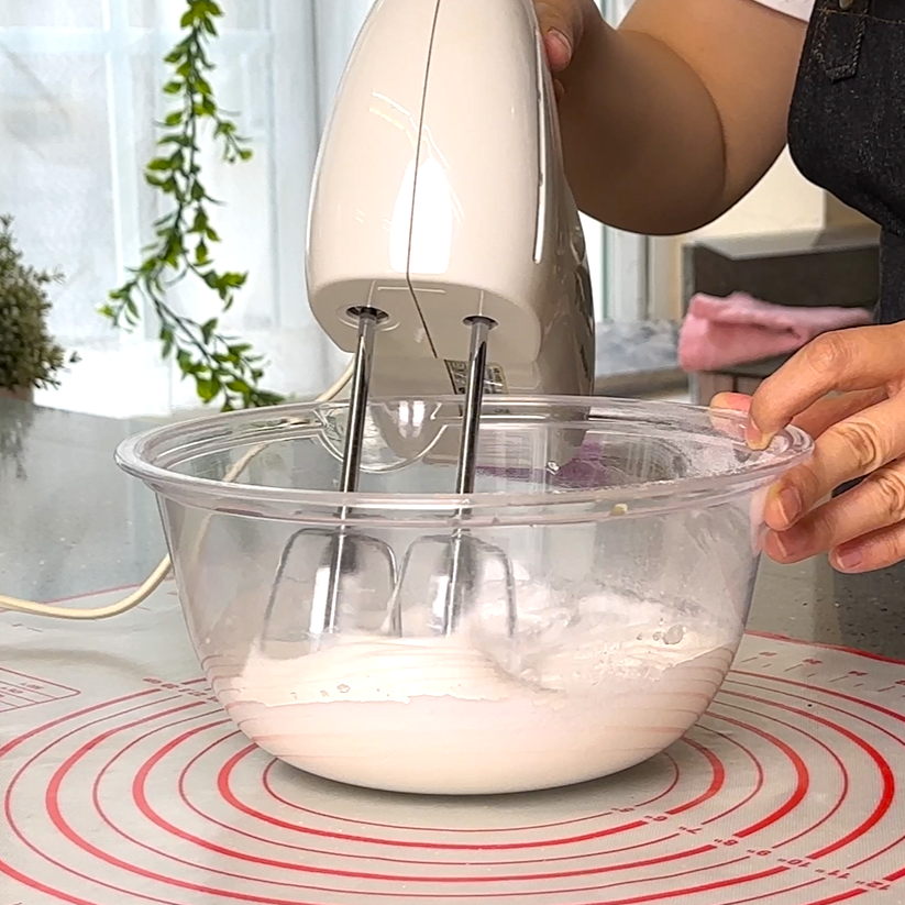 2. 之後逐少加入糖霜,並將蛋白打至企身