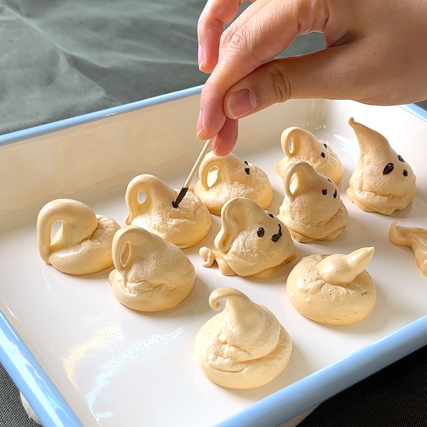 3. 將打好的蛋白裝入唧袋中,然後在琺瑯烘焙盤上按喜好唧成鬼鬼形狀