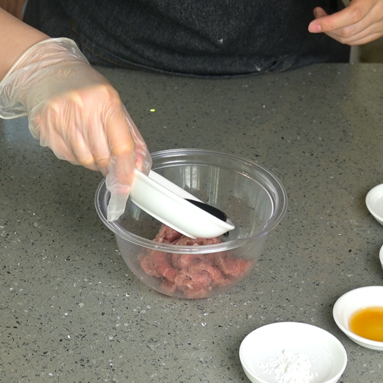 1. 首先將生抽、粟粉、芝麻油、糖、水加入牛肉片中醃10分鐘備用