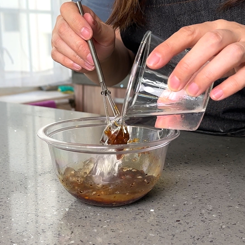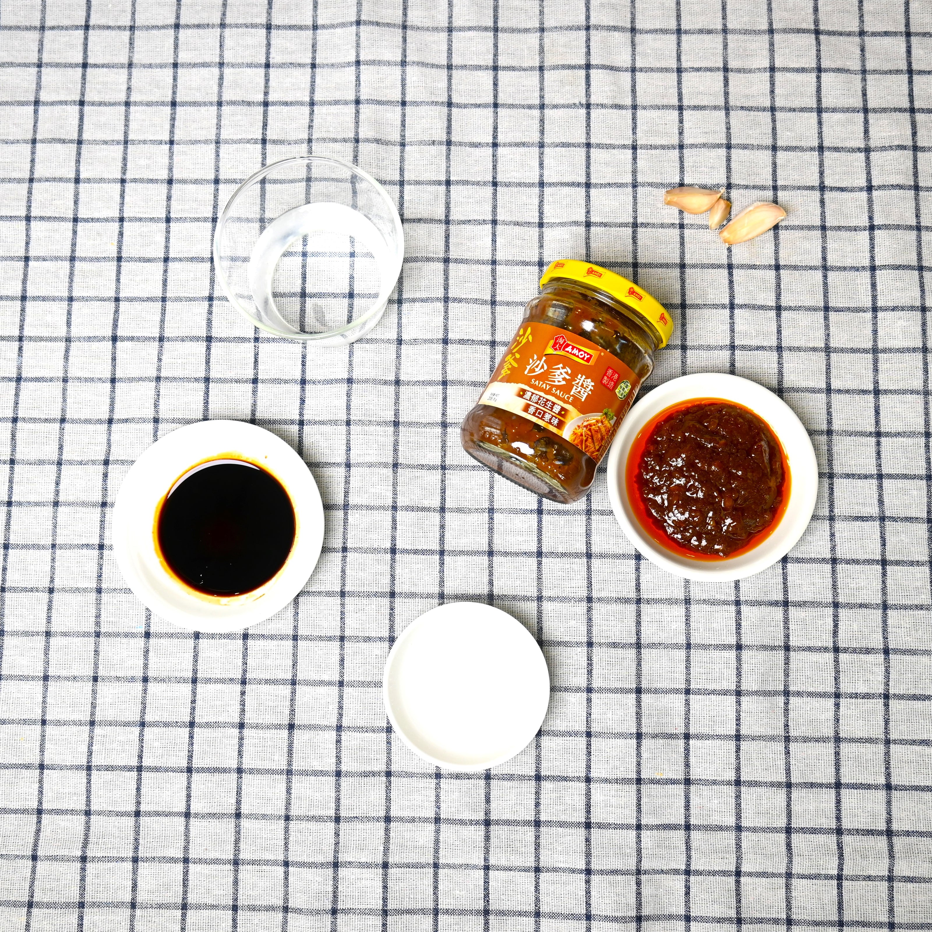 2. 然後將沙爹醬、老抽、蒜蓉、糖、水一同拌勻調出沙爹醬汁備用。