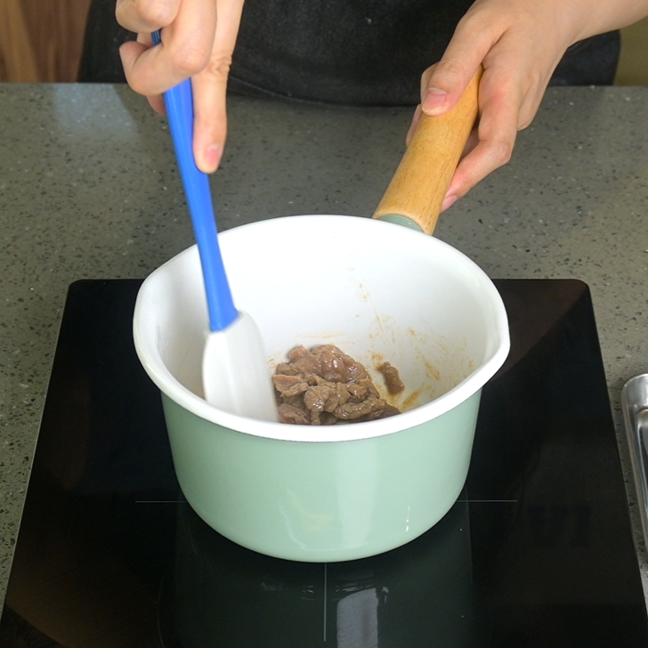 4. 用同一件琺瑯鍋加入調好的沙爹醬,以中火煮滾後,加入牛肉片炒至汁醬略稠便可。