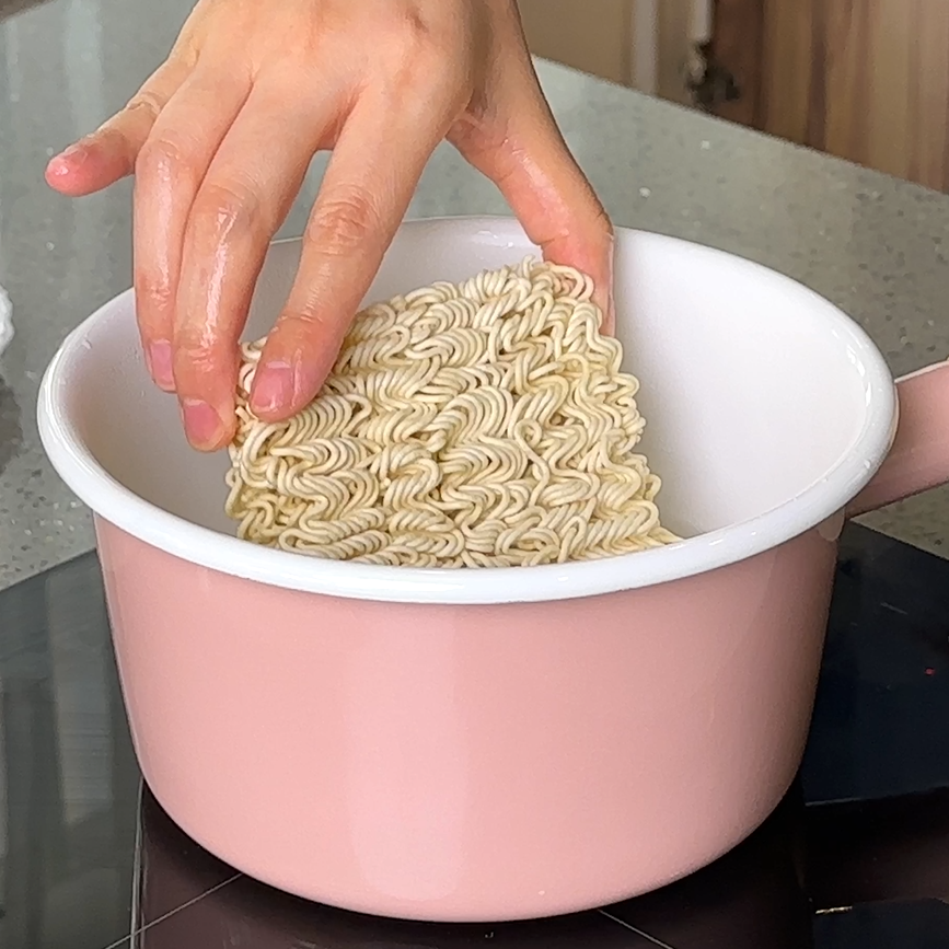 5. 準備另一件琺瑯鍋將500毫升水煮滾,然後放入即食麵煮約3分鐘。