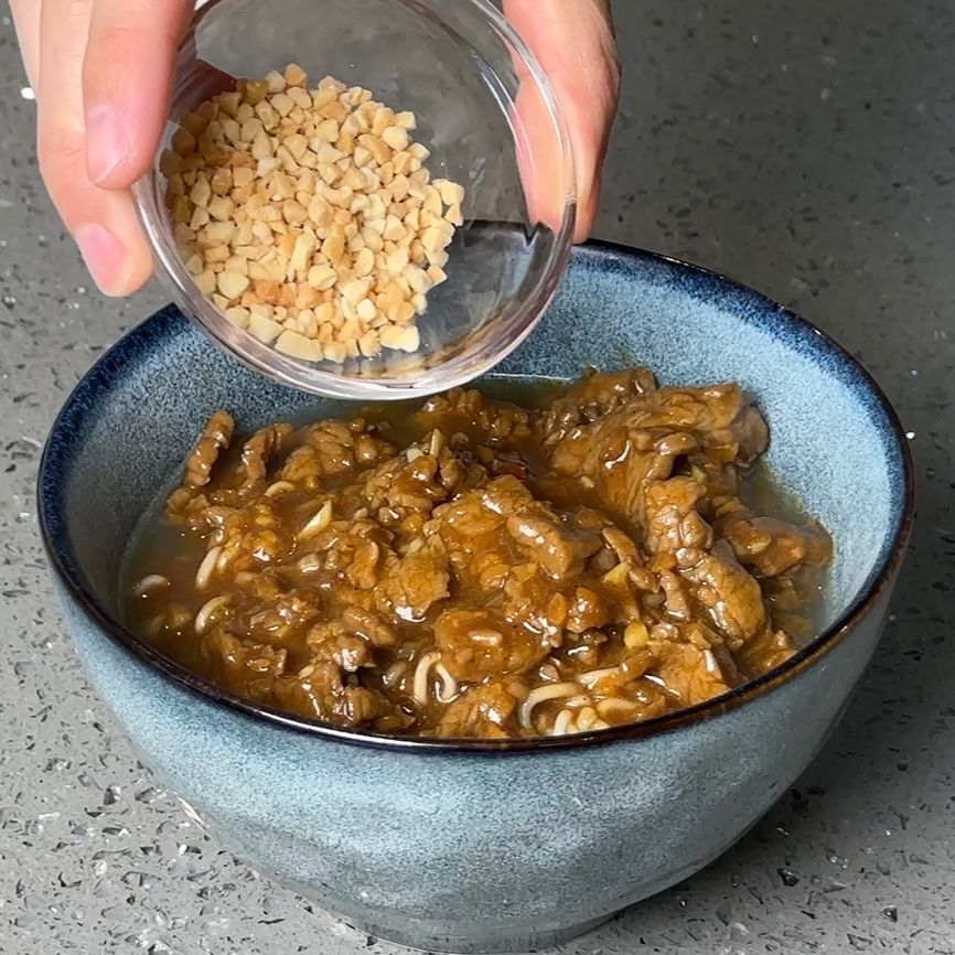 6. 最後將湯麵盛起於碗中,放上沙爹牛肉醬汁,撒上花生碎,就完成啦~
