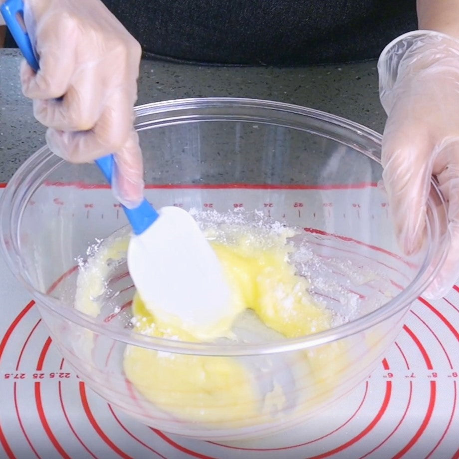 4. 牛油和糖霜放在盤內拌勻, 加入蛋和雲尼拿香油