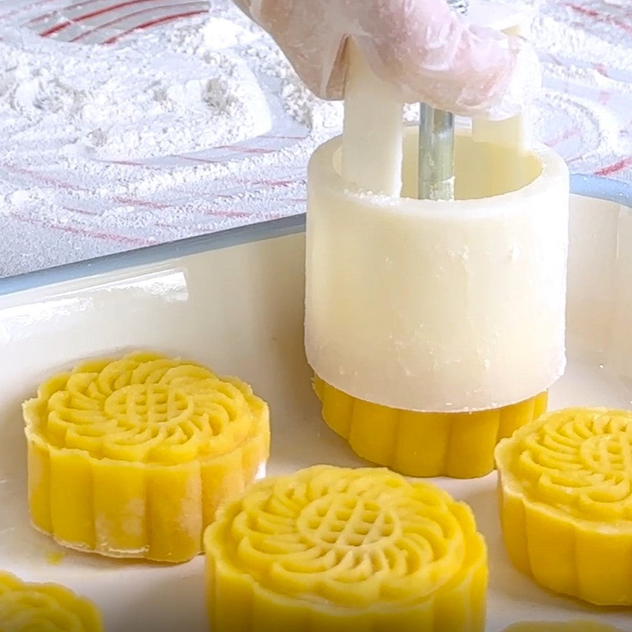 10. 在月餅模具中灑上高筋麵粉, 把麵糰推壓成月餅形狀