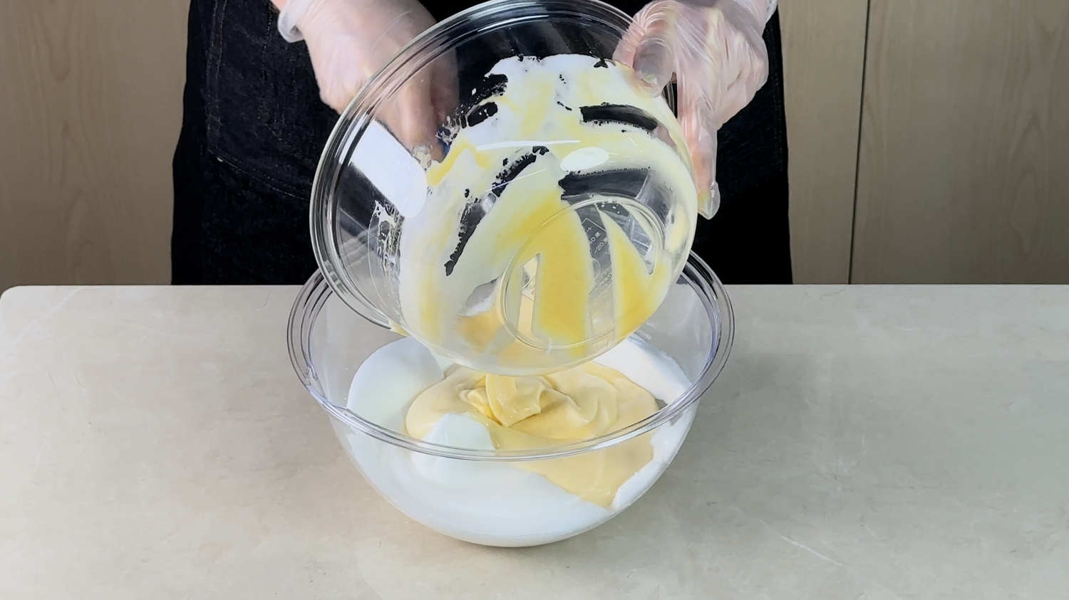 7)再把它倒入剩下的蛋白霜,均勻翻拌。