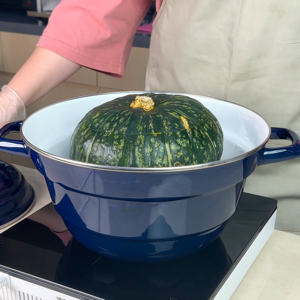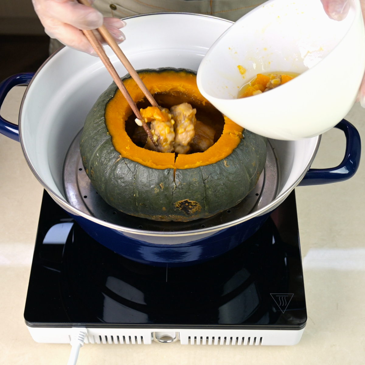 2. 把南瓜洗乾淨,從頂部劃一圈,挖出瓜肉和瓜籽,將南瓜放入琺瑯鍋蒸30分鐘。